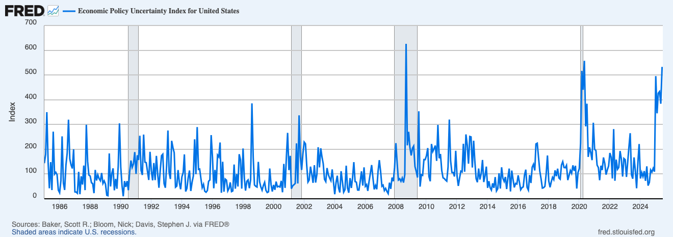 It’s not just a feeling. The data backs it up: The Economic Policy Uncertainty Index, tracked by the St. Louis Fed, has surged to levels not seen since the early days of the COVID-19 pandemic.